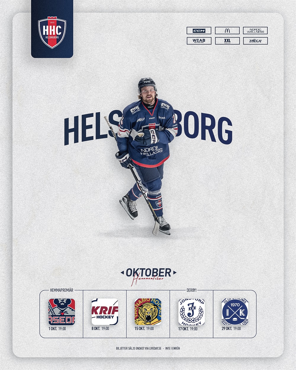 Det väntar en fullspäckad hockeymånad på Olympiarinken. Redan i kväll kliver vårt A-lag ut för säsongens första match på hemmaplan. Längre fram i oktober bjuds det på både ett högintressant möte med KRIF och ett stekhett derby mot Jonstorps IF.