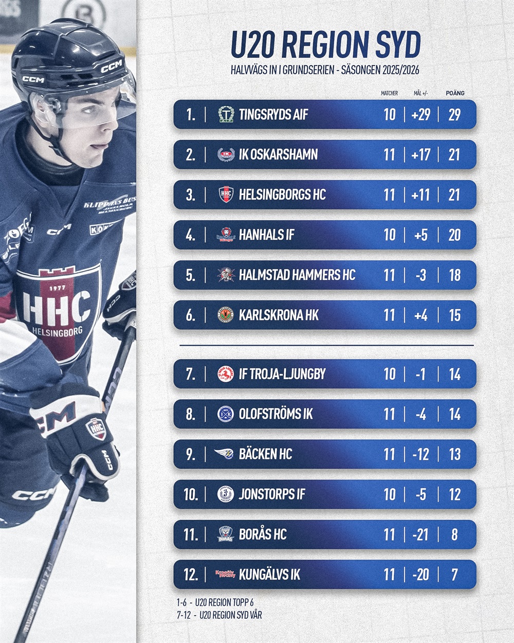 Fortsättningen lär bli rafflande. Topp-sexan i serien går som bekant vidare till ”Topp 6”-serien där man, utan att riskera nedflyttning, tävlar mot U20 Nationell, medan resterande lag får kämpa för att hålla sig kvar i U20 Region (och nypa en enstaka playoffplats till förkvalet). Just nu sitter vårt U20 i en bekväm position, men som alla vet: det går fort i hockey och en halvtidstabell är långt från en sluttabell.