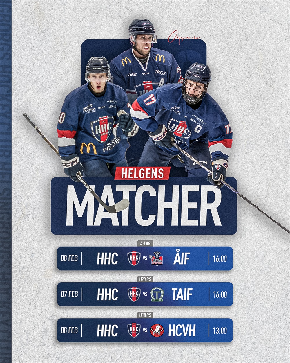 En fullmatad hockeyhelg väntar på Olympiarinken där A‑lag, U20 och U18 kliver ut till idel heta och potentiellt avgörande hemmamatcher.